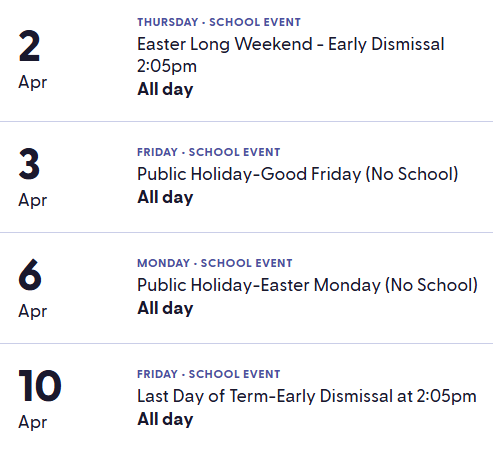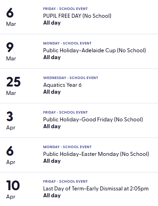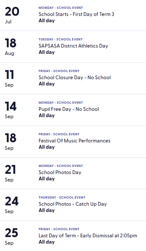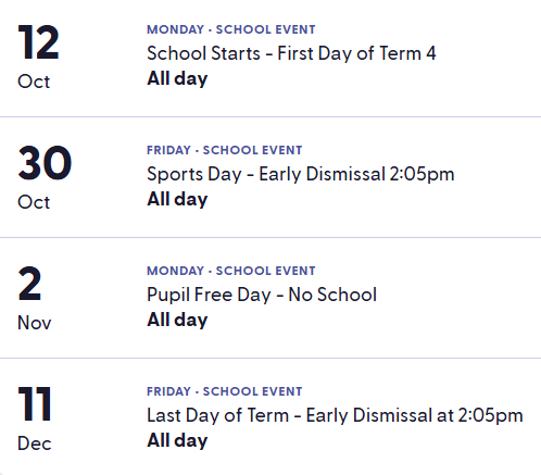 Our school term calendar includes key dates such as term start and end dates, excursions, school events, school holidays, and pupil-free days.